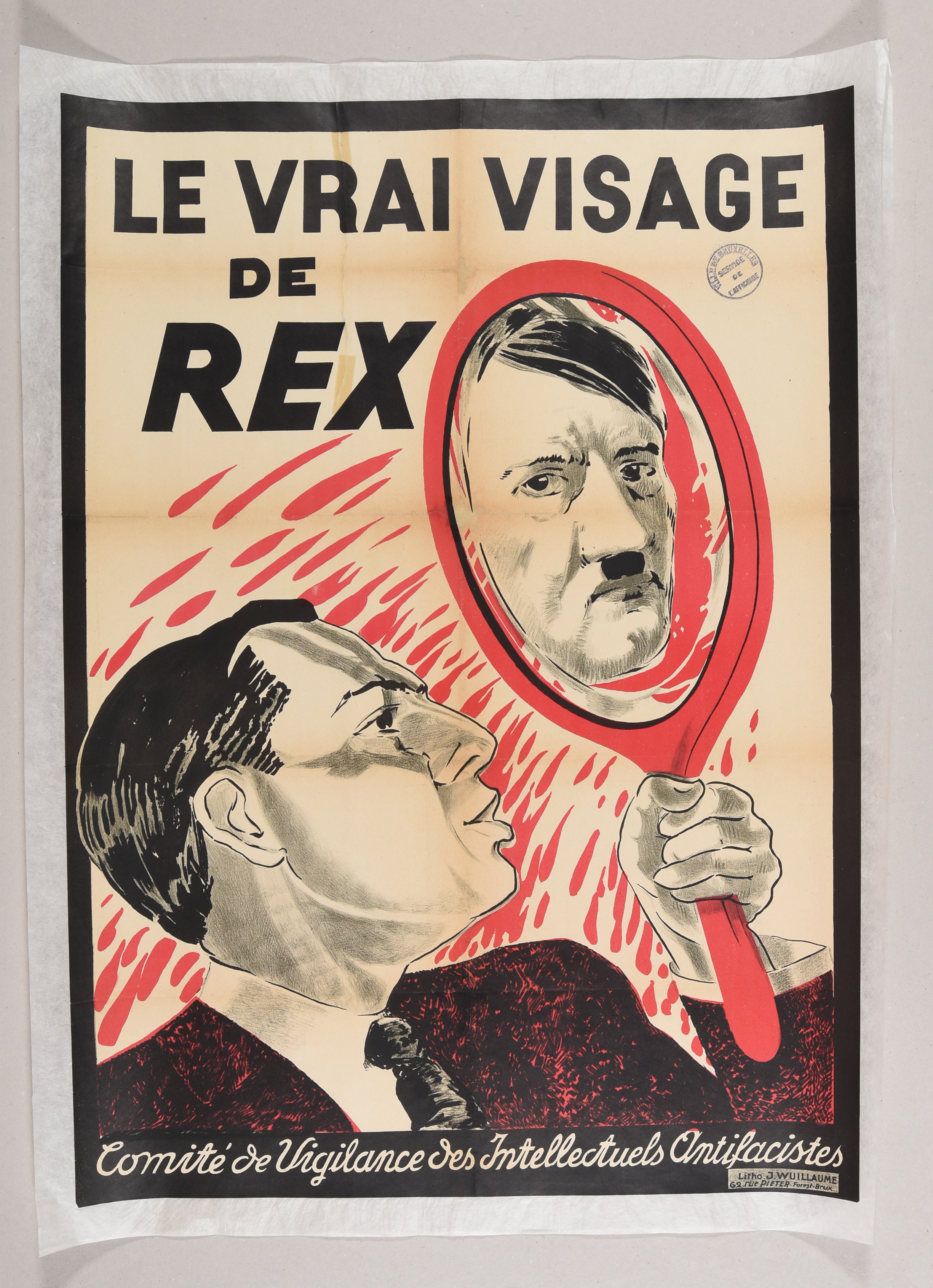 En mai 1936, Rex emporte un succès aux élections. Alarmé par les principes et idées fascistes de ce parti, un groupe d’intellectuels et d’artistes belges, dont des adeptes de la mouvance surréaliste, se lance dans le militantisme anti-fasciste. À cette occasion, Magritte, le chef de file des surréalistes belges, crée l’affiche « Le vrai visage de Rex » dans laquelle il représente Degrelle qui se regarde dans un miroir reflétant le visage d’Hitler.